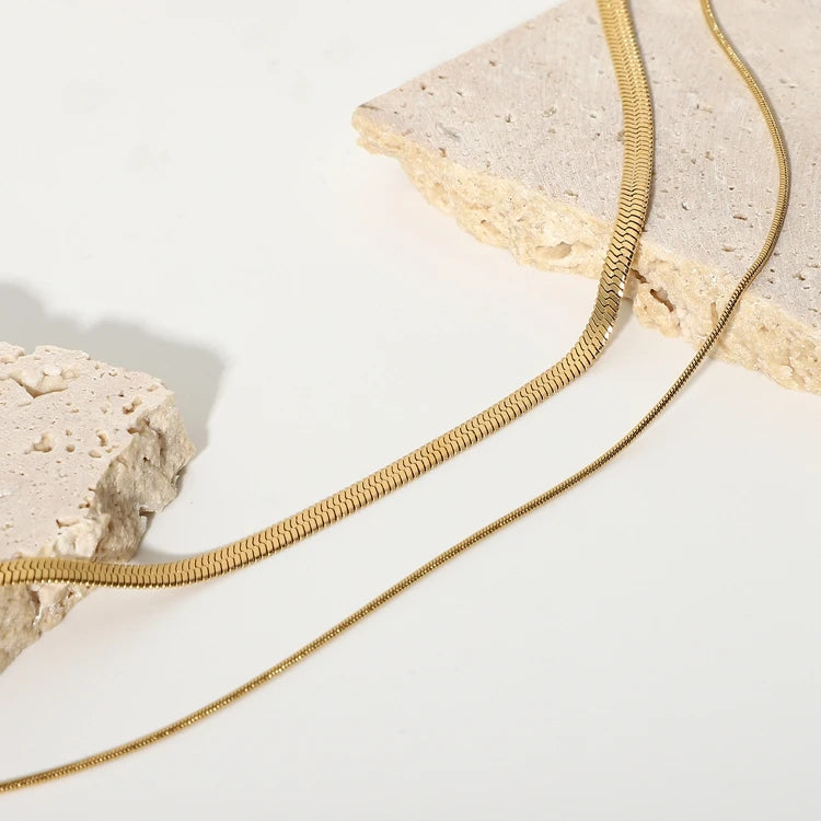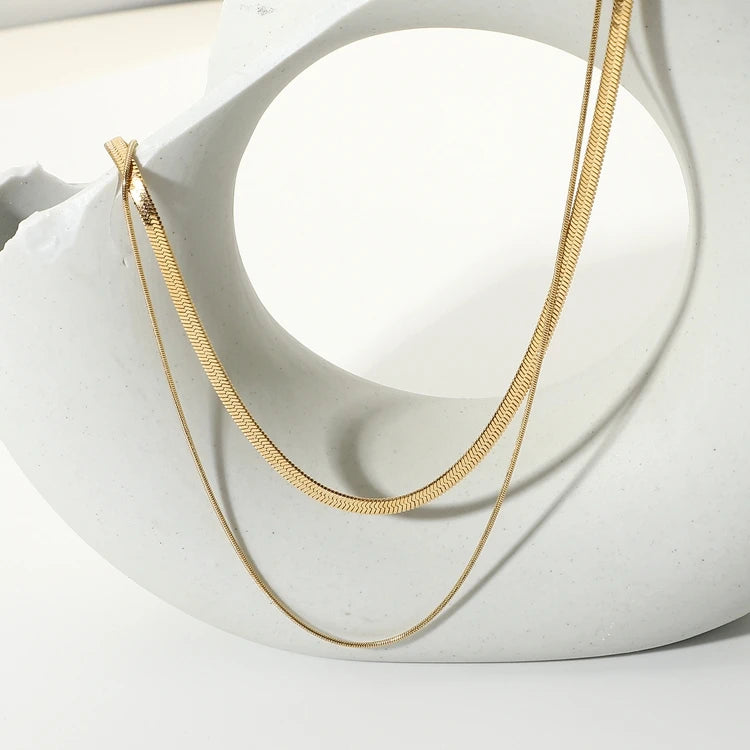 ステンレス304 低ニッケル 水に濡れても錆びにくい 18Kゴールドメッキ ネックレス 2連 スネークチェーン 【YJ02213】