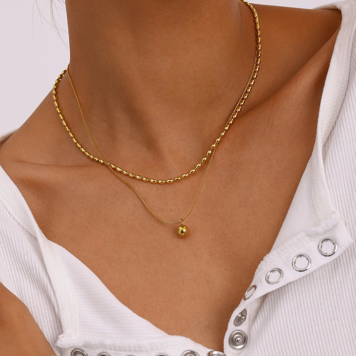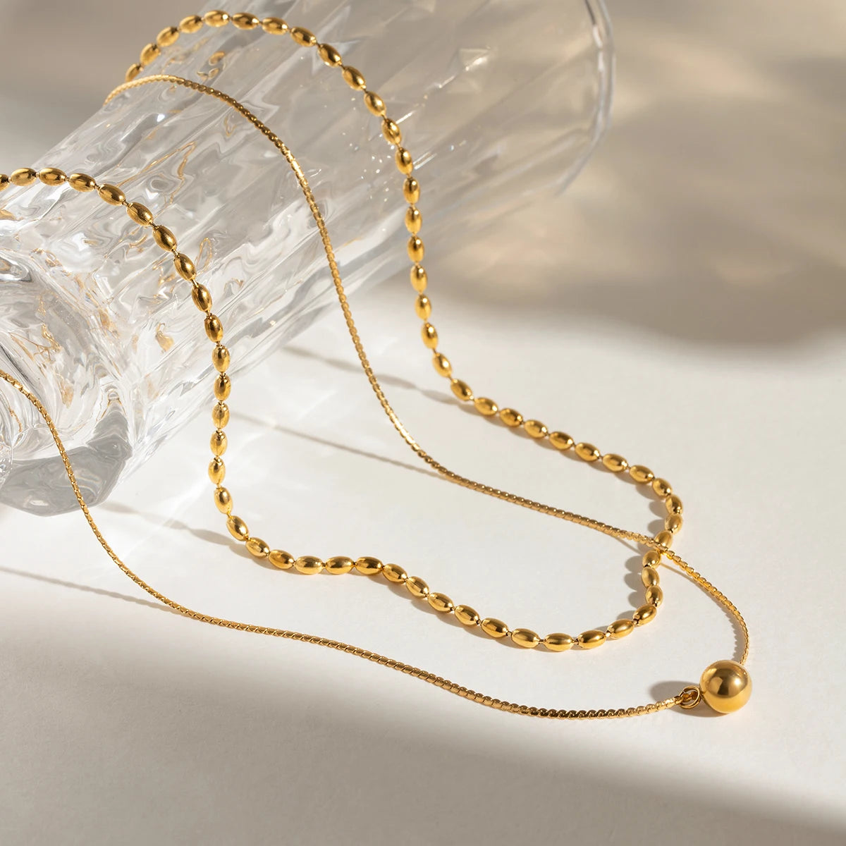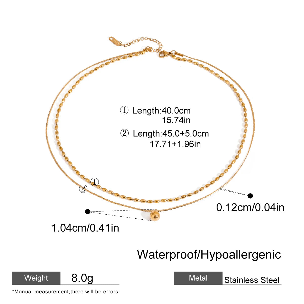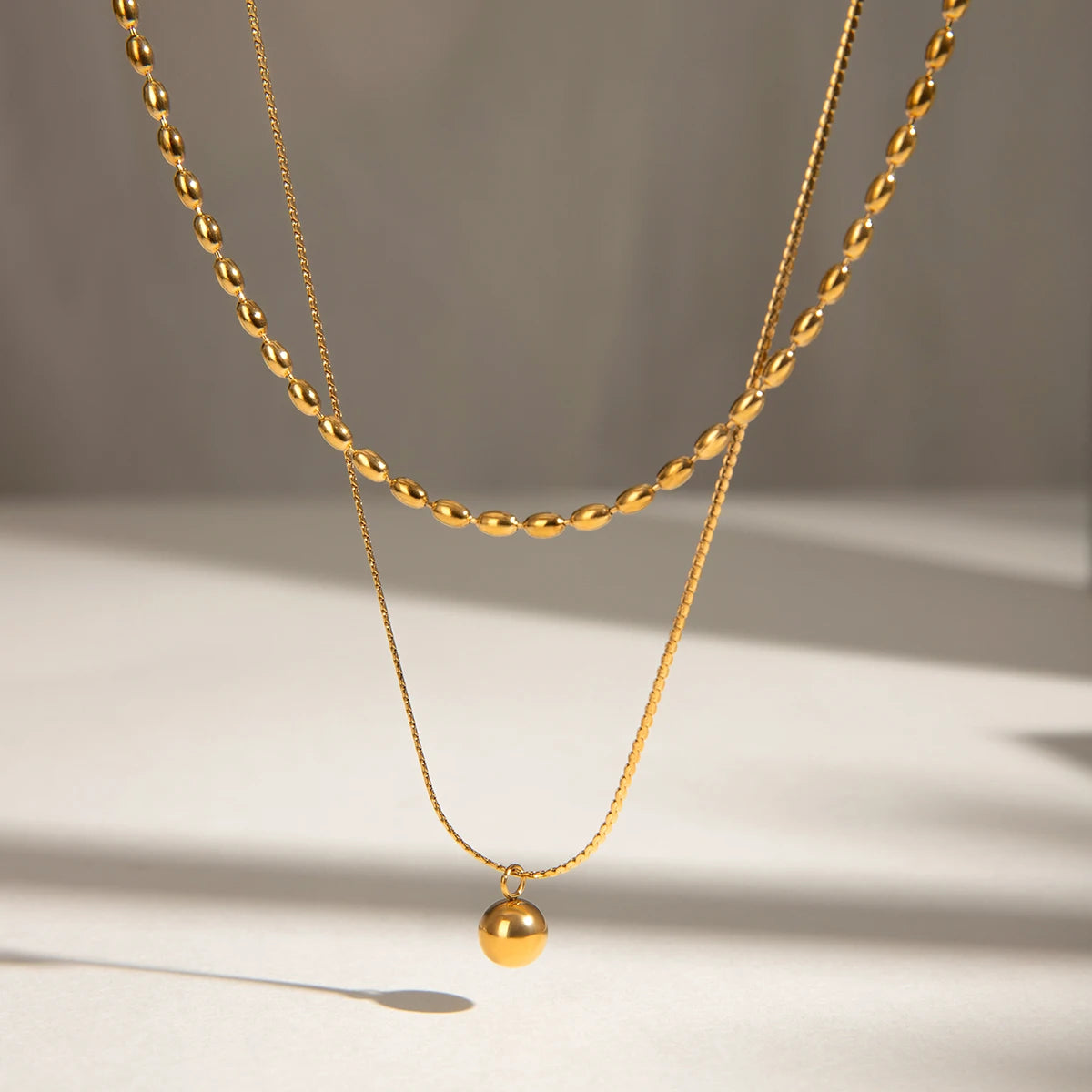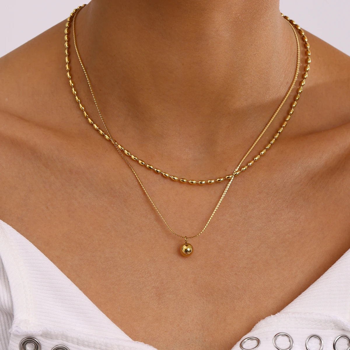 ステンレス304 低ニッケル 水に濡れても錆びにくい 18Kゴールドメッキ ネックレス 2連 チェーン ボール 【YJ02773】
