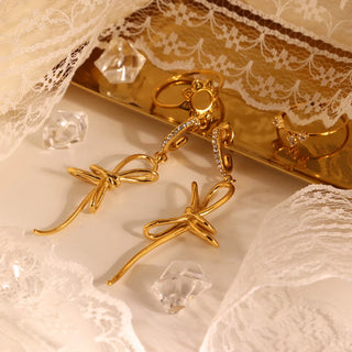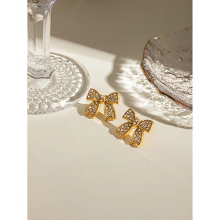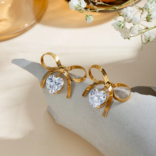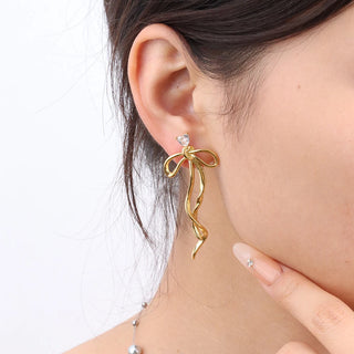 ステンレス304 低ニッケル 水に濡れても錆びにくい 18Kゴールドメッキ ピアス リボン ジルコニア【YJ02117】