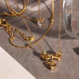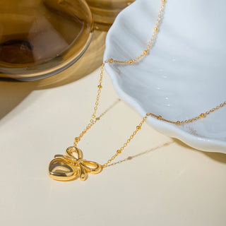 ステンレス304 低ニッケル 水に濡れても錆びにくい 18Kゴールドメッキ ネックレス ハート リボン 【YJ02183】