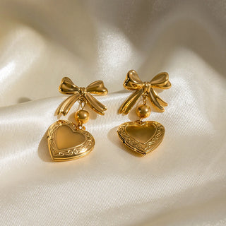 ステンレス304 低ニッケル 水に濡れても錆びにくい 18Kゴールドメッキ ピアス 写真入れ ロケットペンダント リボン ハート【YJ03137】
