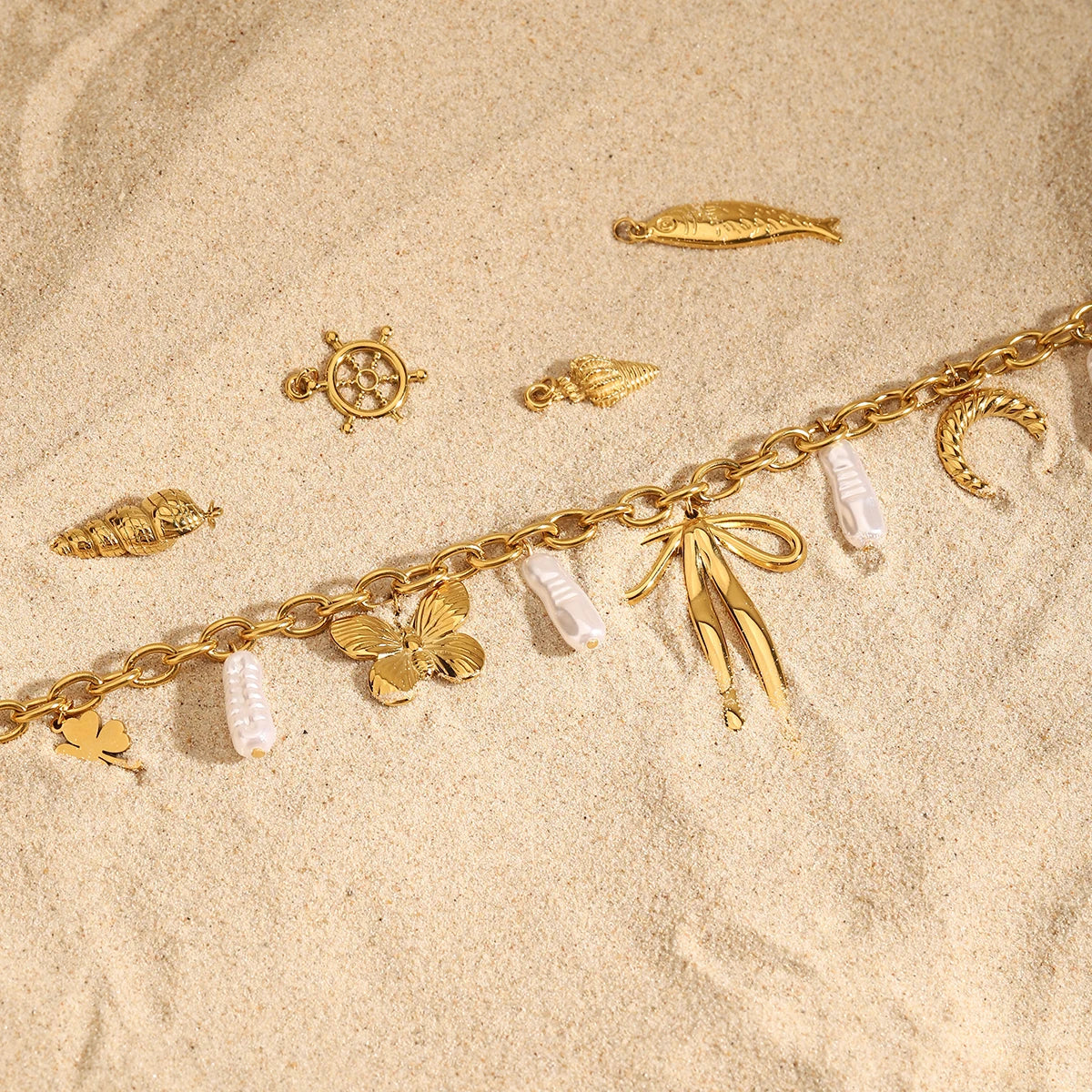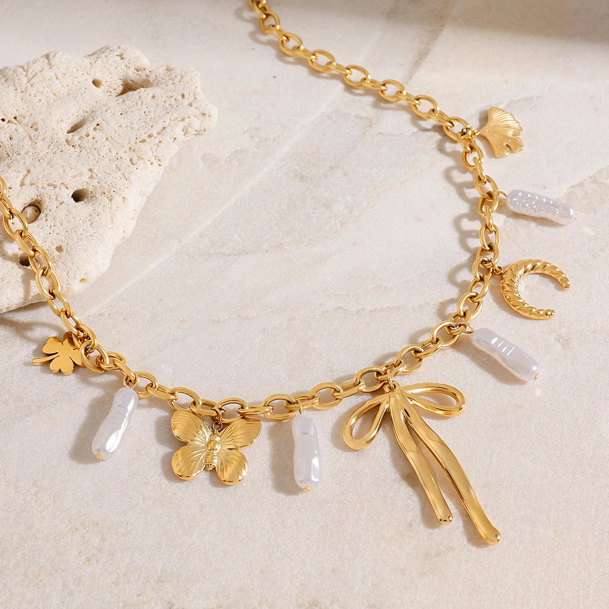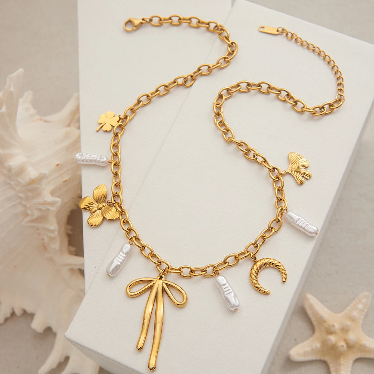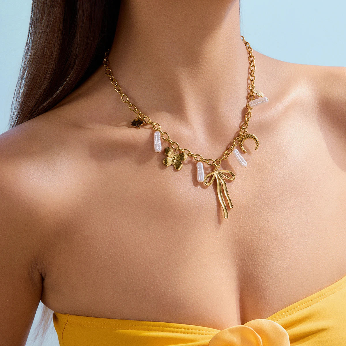 ステンレス304 低ニッケル 水に濡れても錆びにくい 18Kゴールドメッキ ネックレス リボン チャーム【YJ01252】