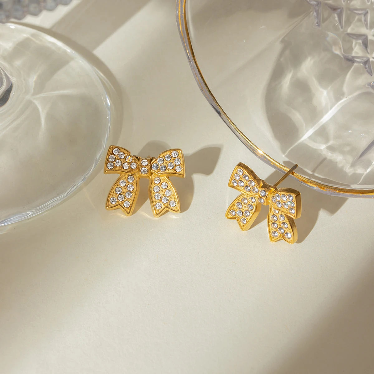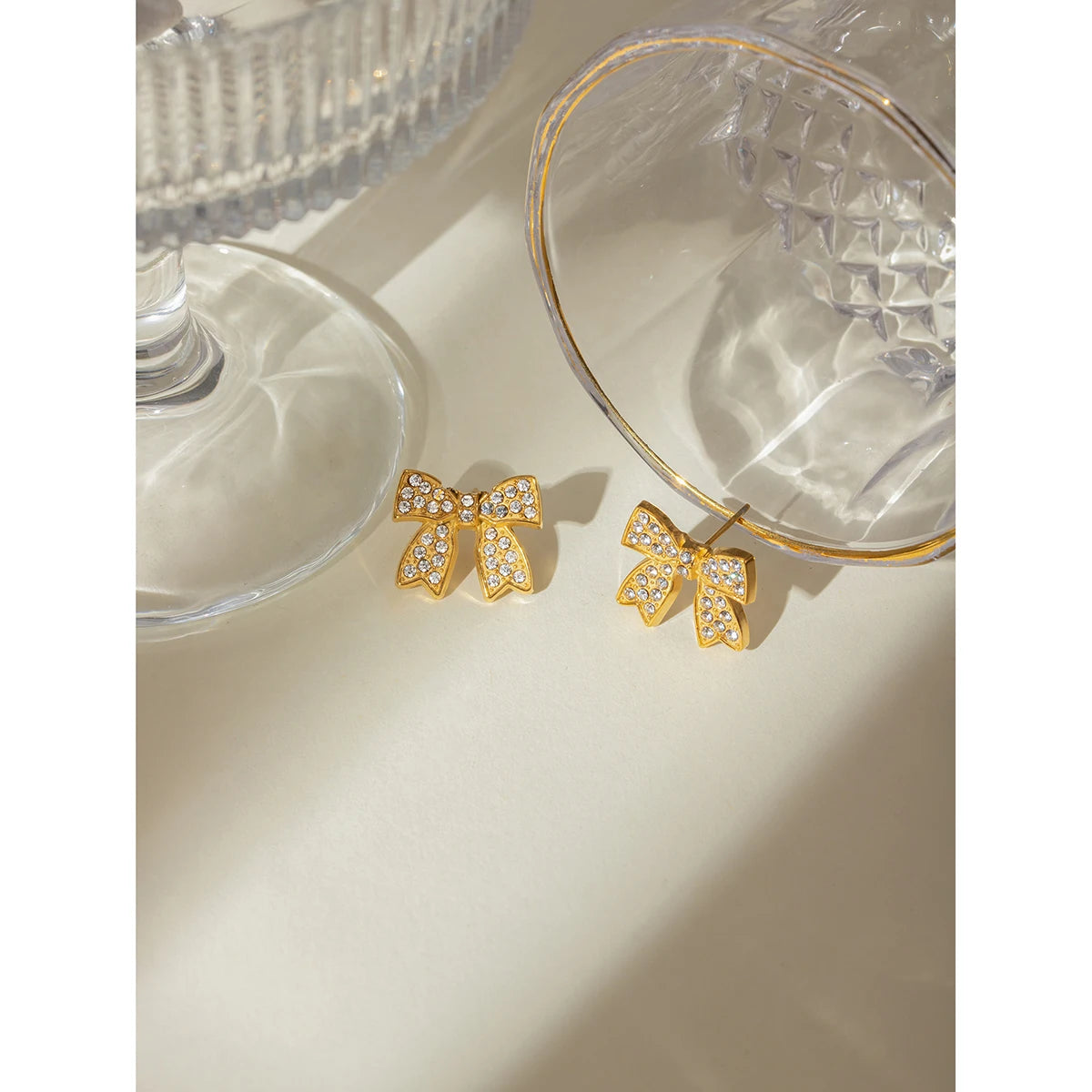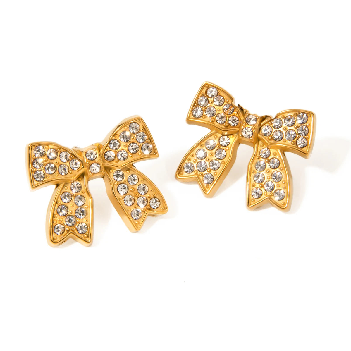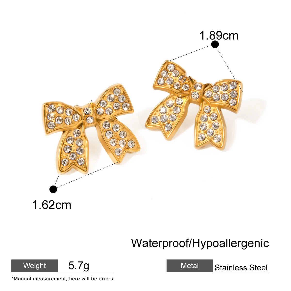 ステンレス304 低ニッケル 水に濡れても錆びにくい 18Kゴールドメッキ ピアス リボン ジルコニア【YJ02117】