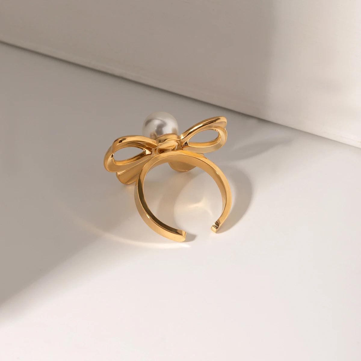ステンレス304 低ニッケル 水に濡れても錆びにくい 18Kゴールドメッキ リング リボン パール 【YJ02354】