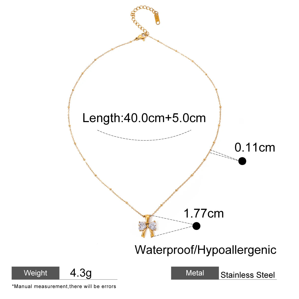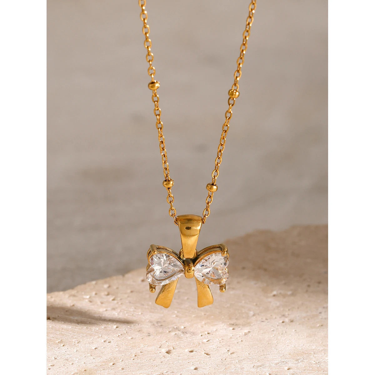 ステンレス304 低ニッケル 水に濡れても錆びにくい 18Kゴールドメッキ ネックレス リボン ジルコニア 【YJ02586】