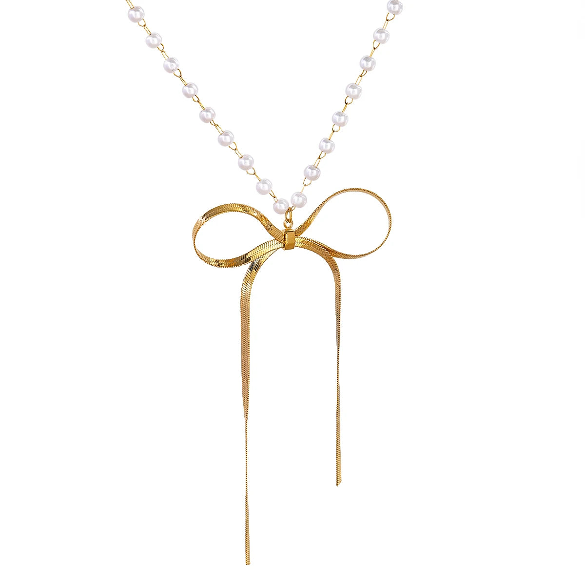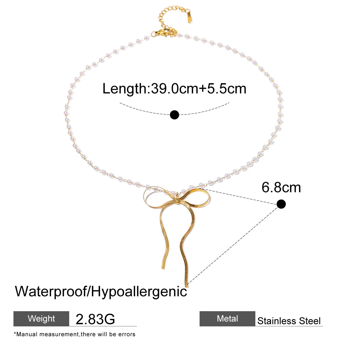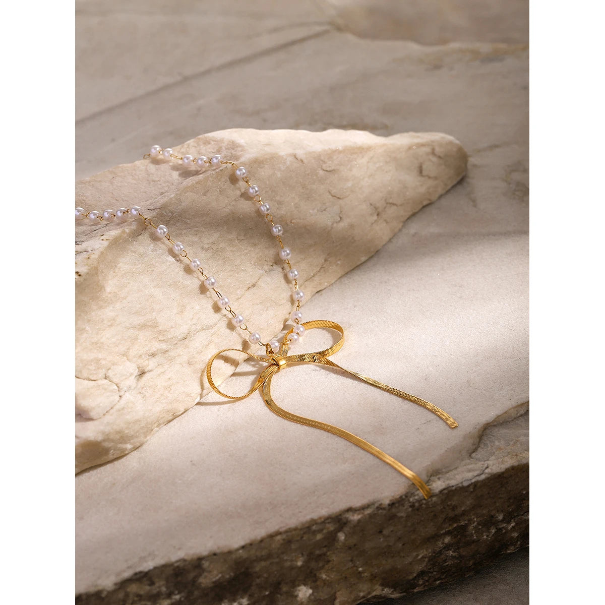 ステンレス304 低ニッケル 水に濡れても錆びにくい 18Kゴールドメッキ ネックレス リボン パール 【YJ03695】