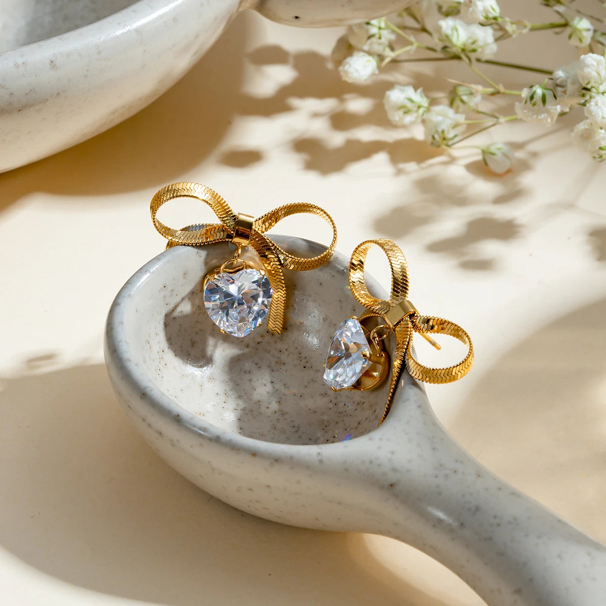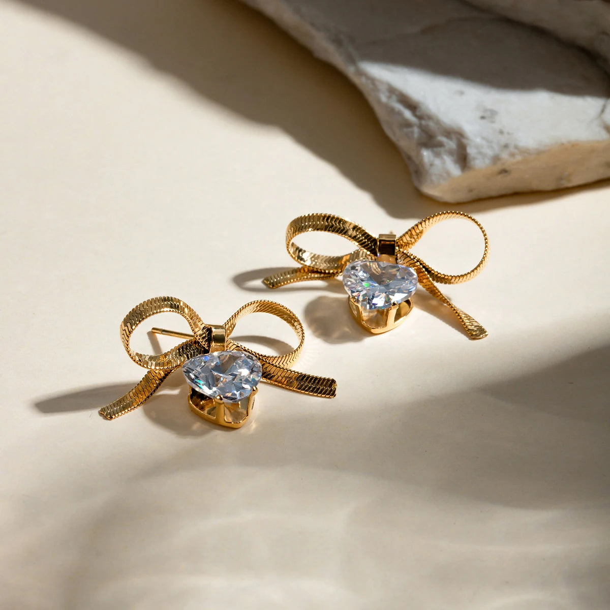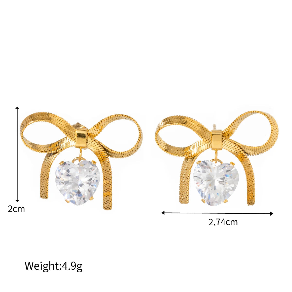 ステンレス304 低ニッケル 水に濡れても錆びにくい 18Kゴールドメッキ ピアス スネークチェーン ハート リボン ジルコニア 【YJ03875】