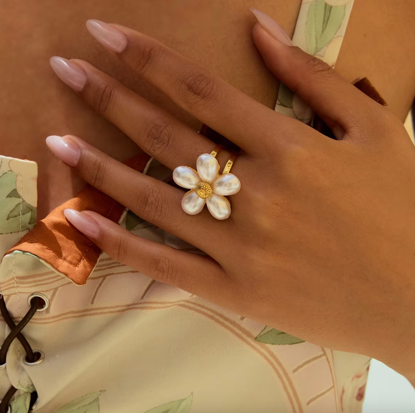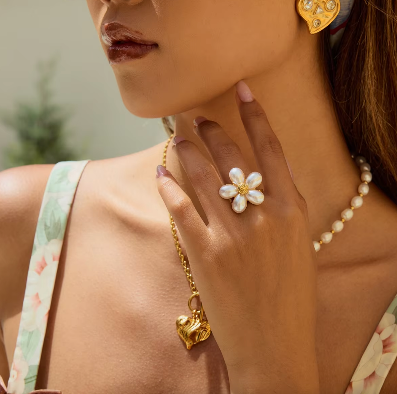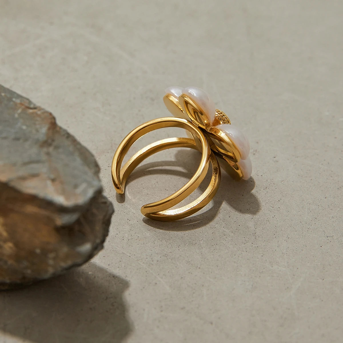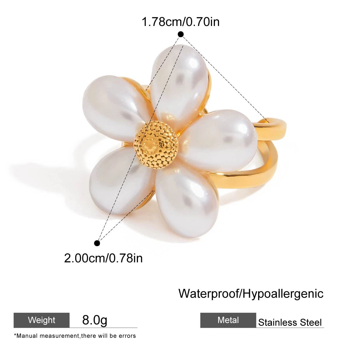 ステンレス304 ニッケルフリー 水に濡れても錆びにくい 18Kゴールドメッキ リング フラワー 花 パール【YJ00105】