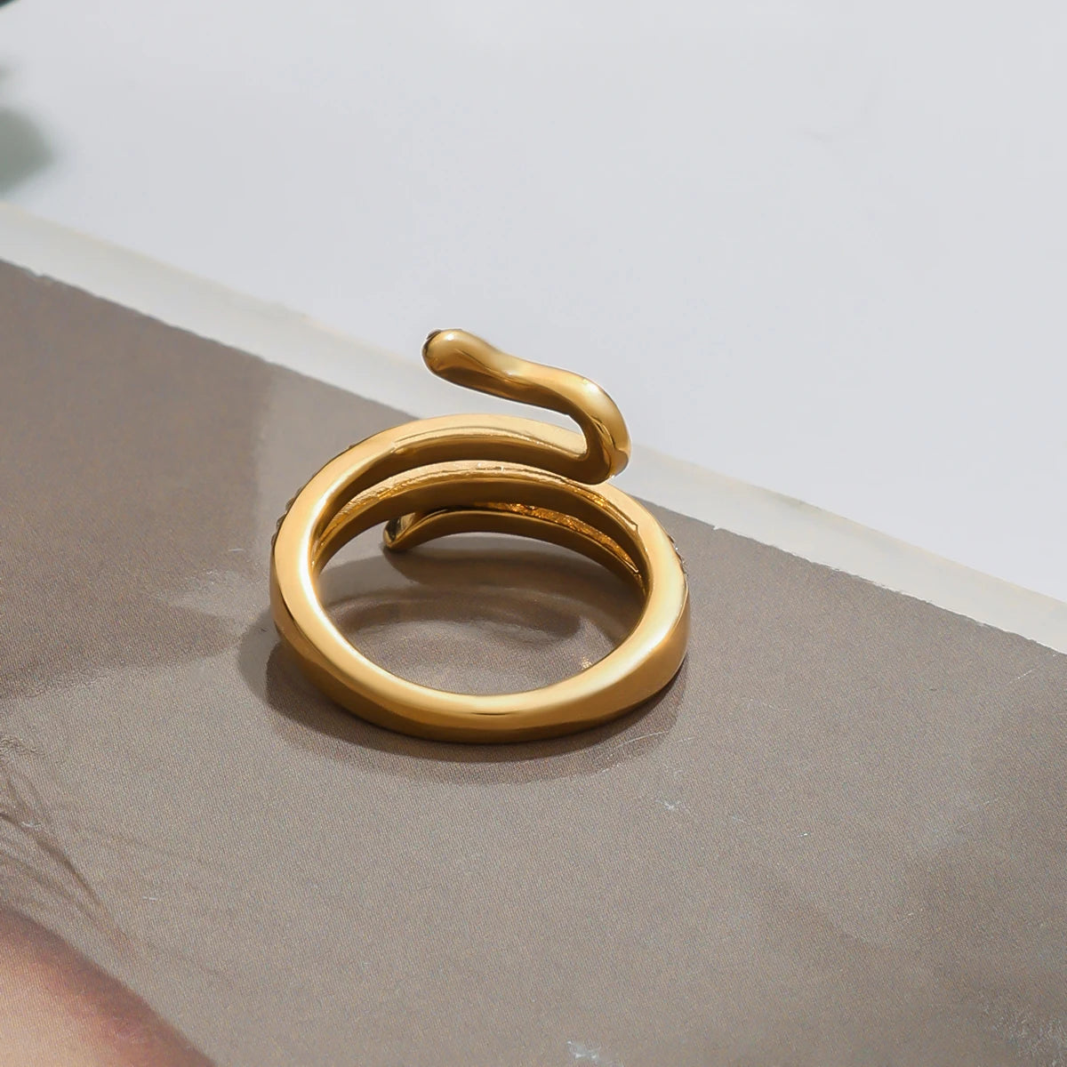 ステンレス304 低ニッケル 水に濡れても錆びにくい 18Kゴールドメッキ リング 蛇 ヘビ スネーク ジルコニア 【YJ01957】