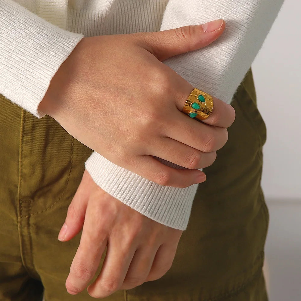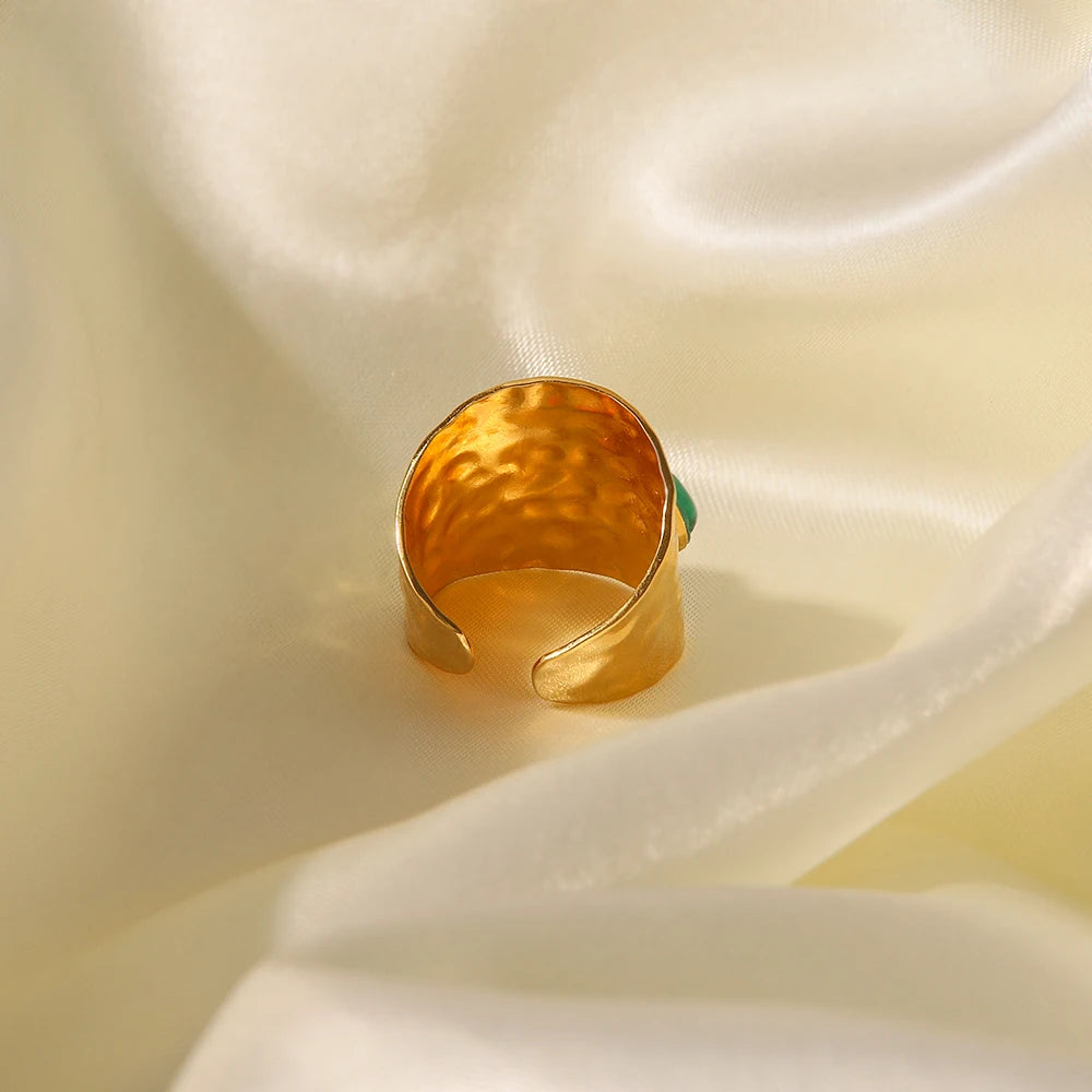 ステンレス304 低ニッケル 水に濡れても錆びにくい 18Kゴールドメッキ リング チャンキー 天然石風ストーン 【YJ03630】