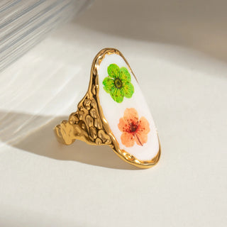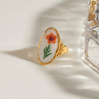 ステンレス304 低ニッケル 水に濡れても錆びにくい 18Kゴールドメッキ リング スクエア フラワー 花 エナメル 【YJ03689】