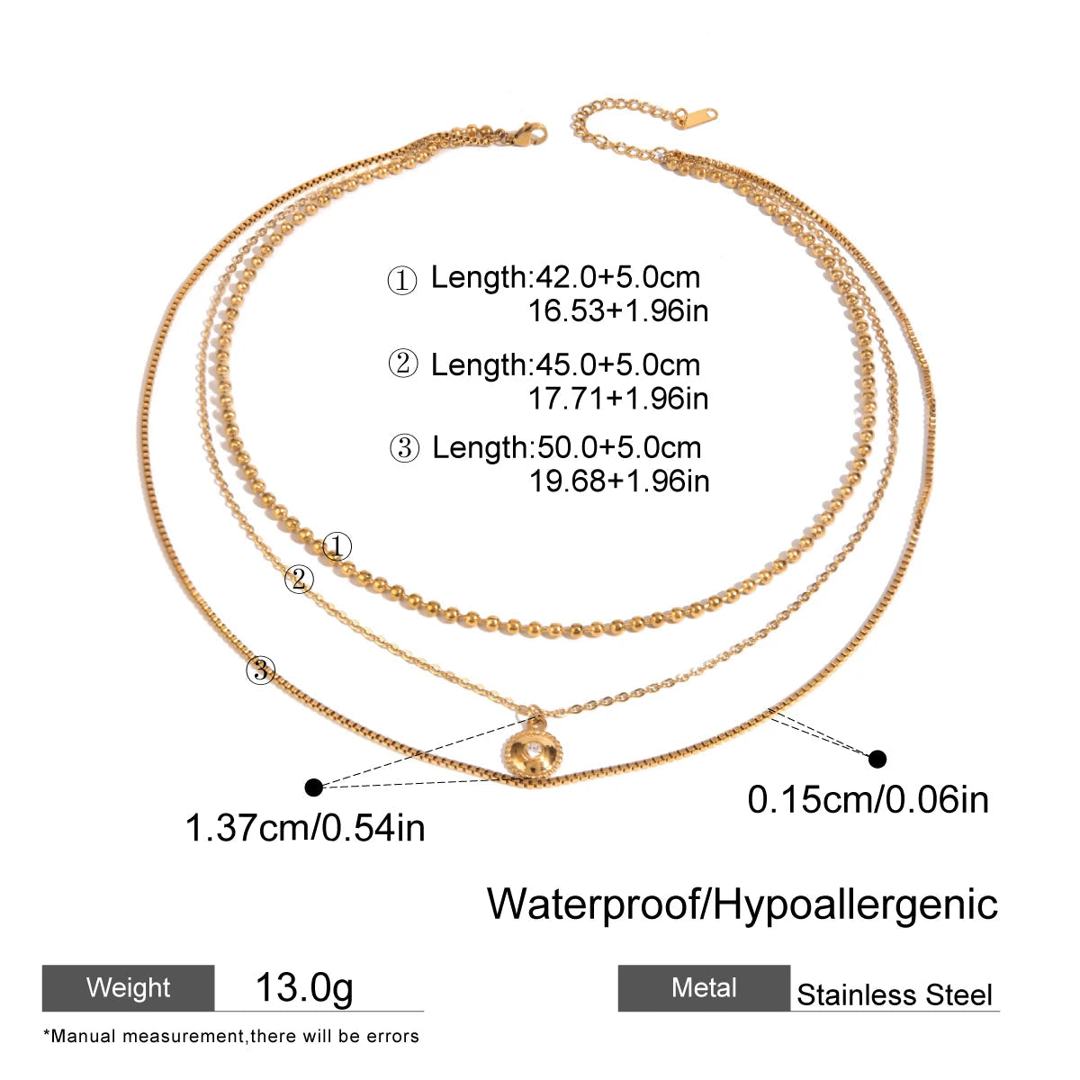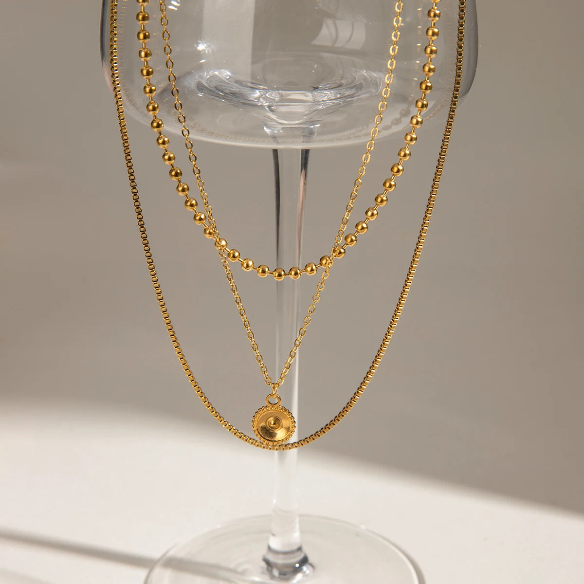 ステンレス304 低ニッケル 水に濡れても錆びにくい 18Kゴールドメッキ ネックレス 3連 ラウンド 【YJ03071】
