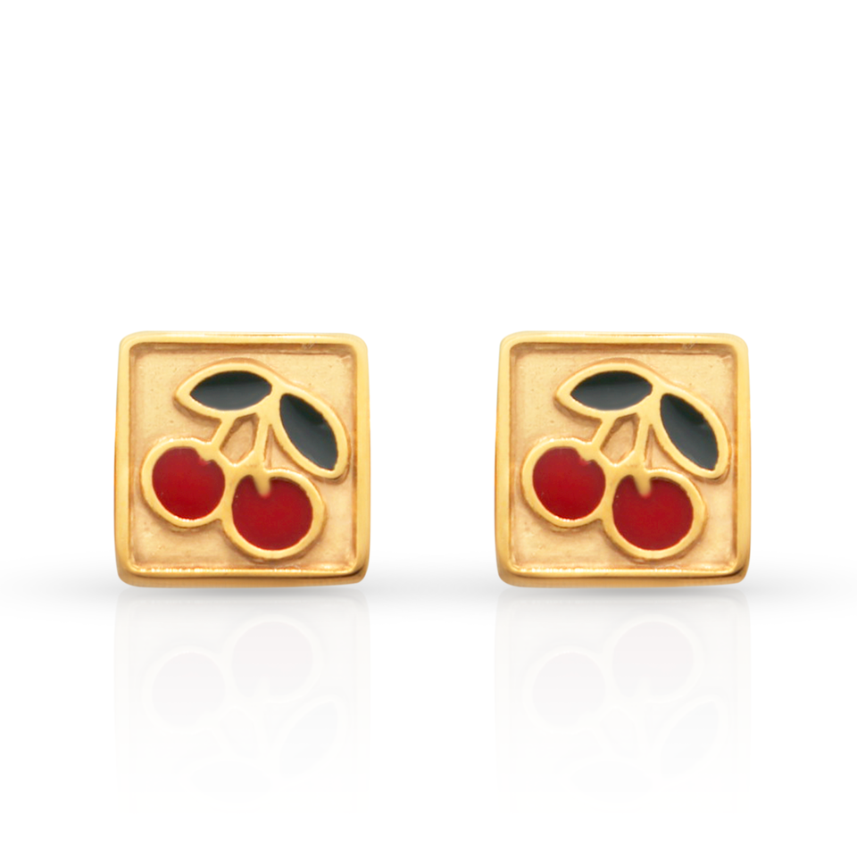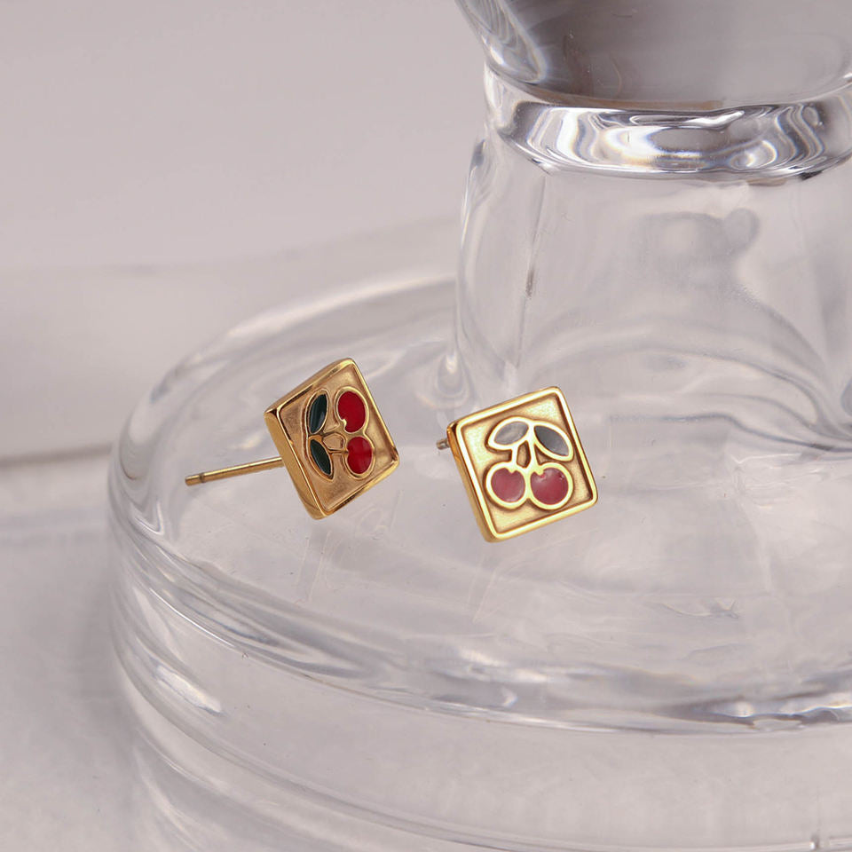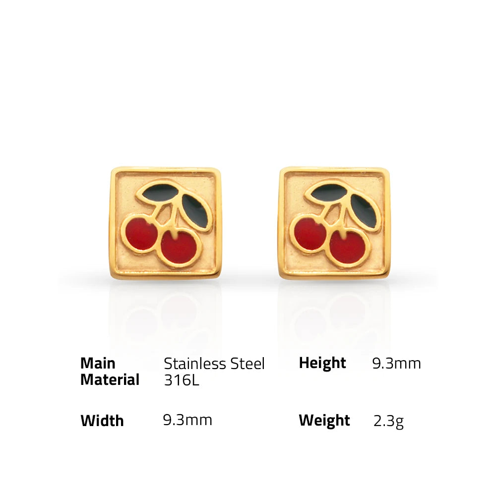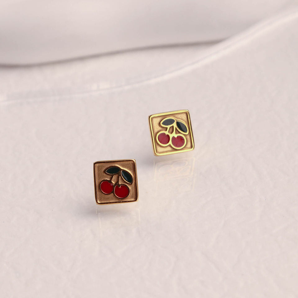 316Lサージカルステンレス 18Kゴールドメッキ ピアス スクエア エナメル さくらんぼ チェリー【NY01032】