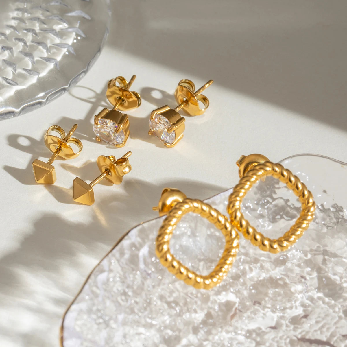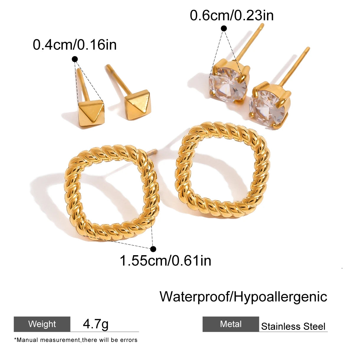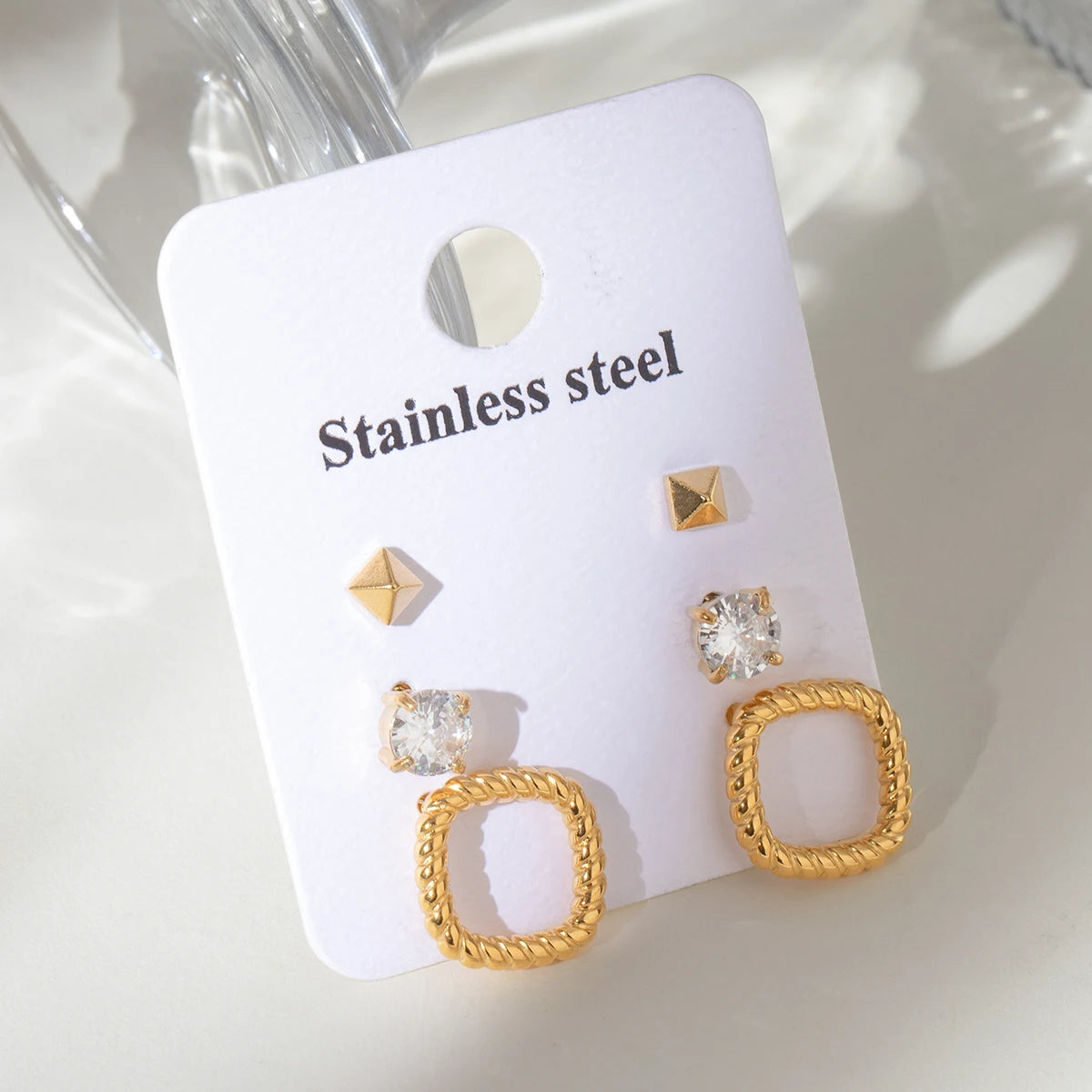 ステンレス304 低ニッケル 水に濡れても錆びにくい 18Kゴールドメッキ ピアス スクエア ジルコニア 3点セット【YJ03181】