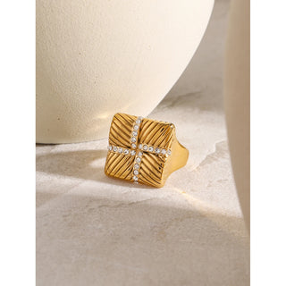 ステンレス304 低ニッケル 水に濡れても錆びにくい 18Kゴールドメッキ リング ツイスト スクエア ジルコニア 【YJ02871】
