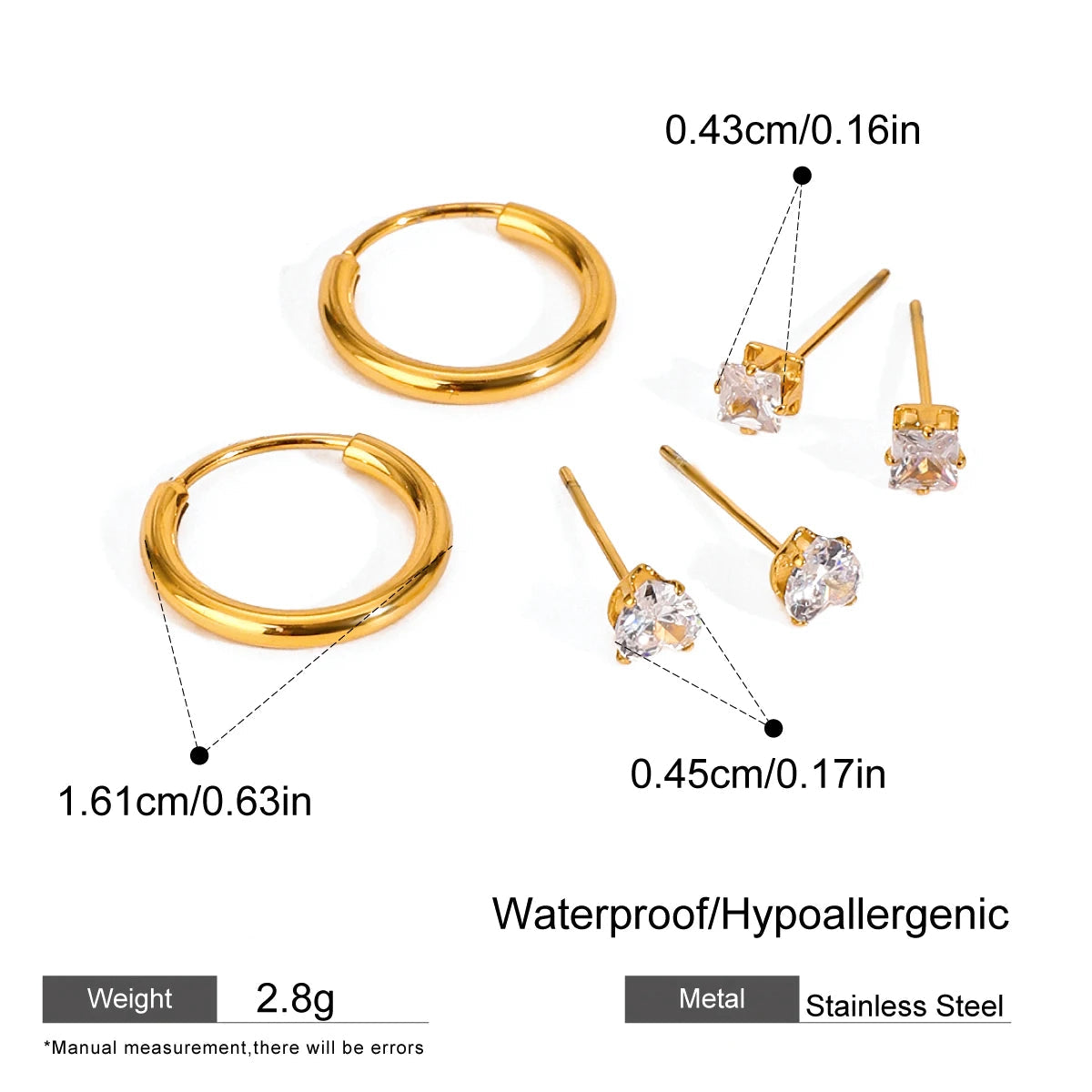 ステンレス304 低ニッケル 水に濡れても錆びにくい 18Kゴールドメッキ ピアス フープ ジルコニア 3点セット【YJ02916】