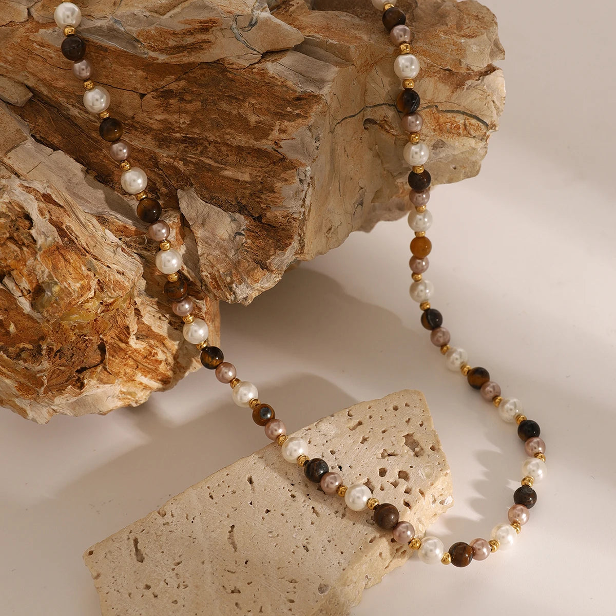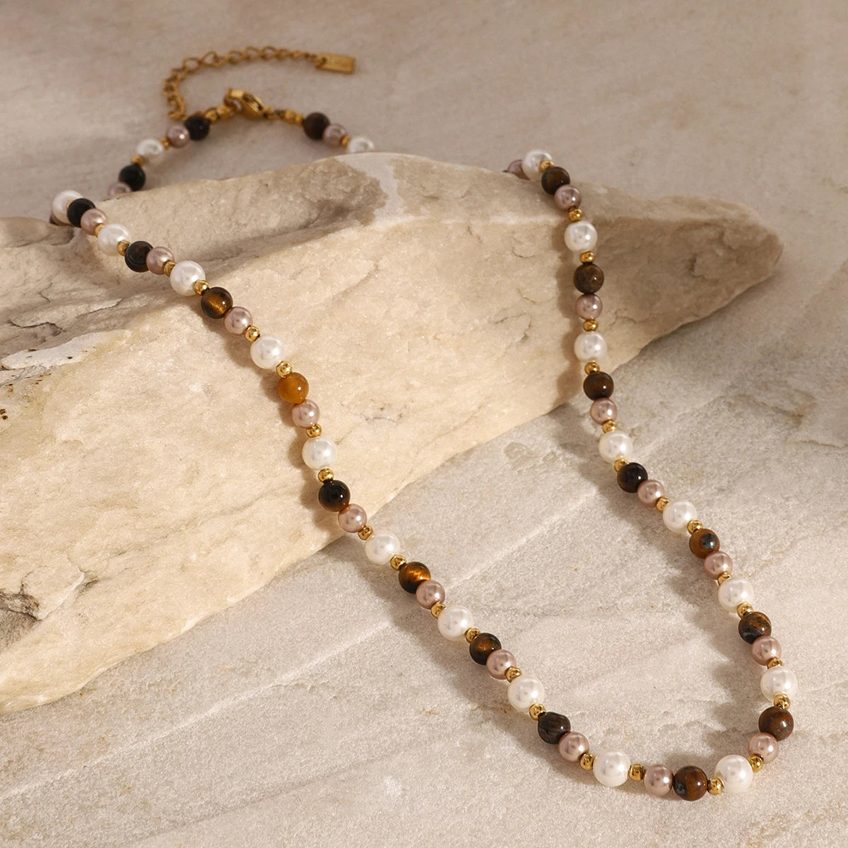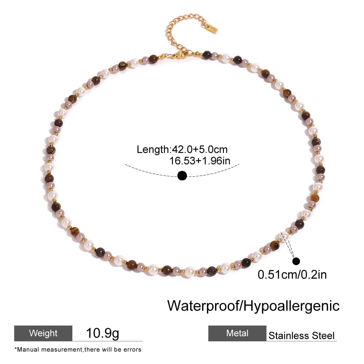 ステンレス304 低ニッケル 水に濡れても錆びにくい 18Kゴールドメッキ ネックレス パール ビーズ 天然石風ストーン 【YJ03190】
