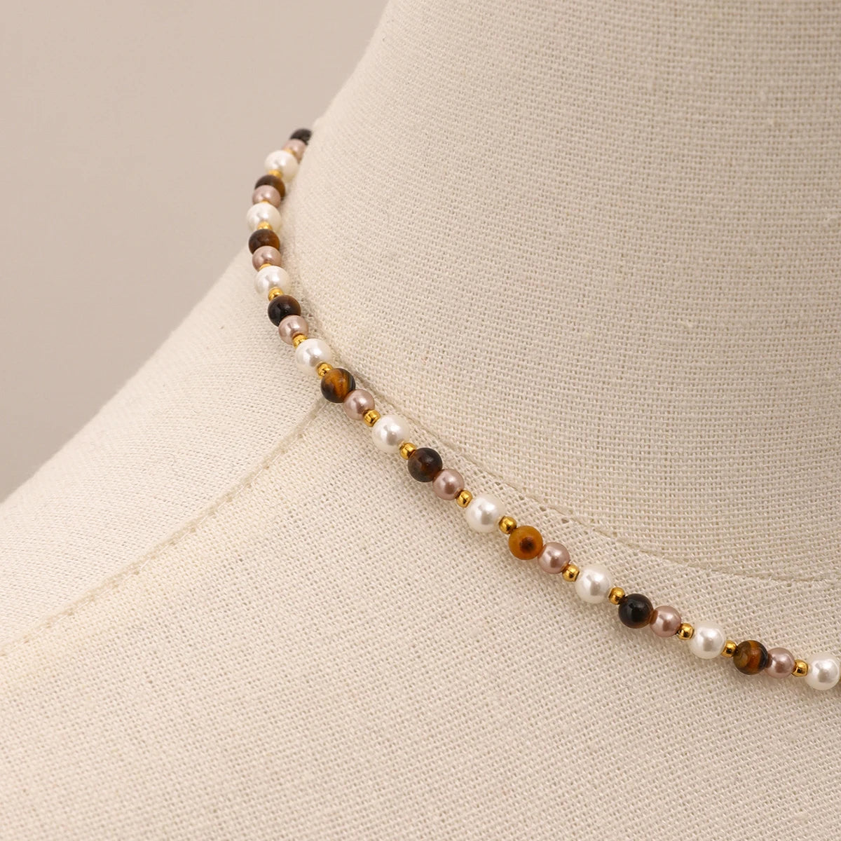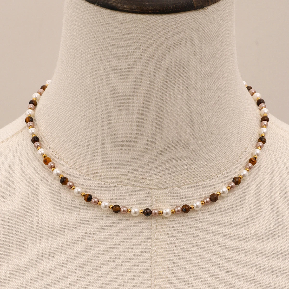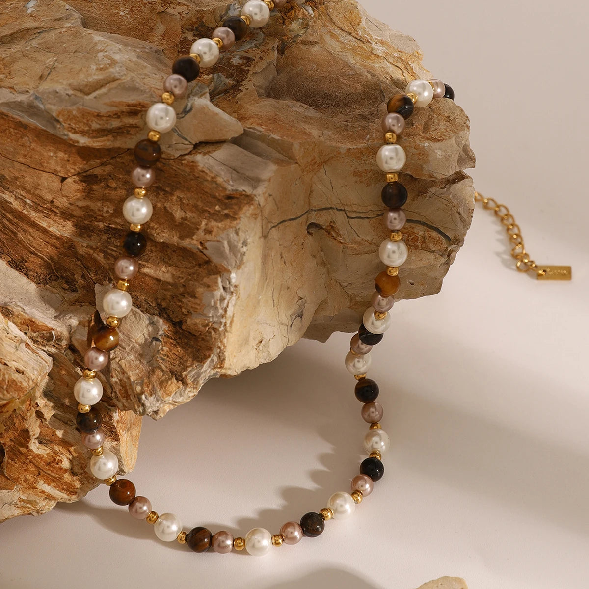ステンレス304 低ニッケル 水に濡れても錆びにくい 18Kゴールドメッキ ネックレス パール ビーズ 天然石風ストーン 【YJ03190】