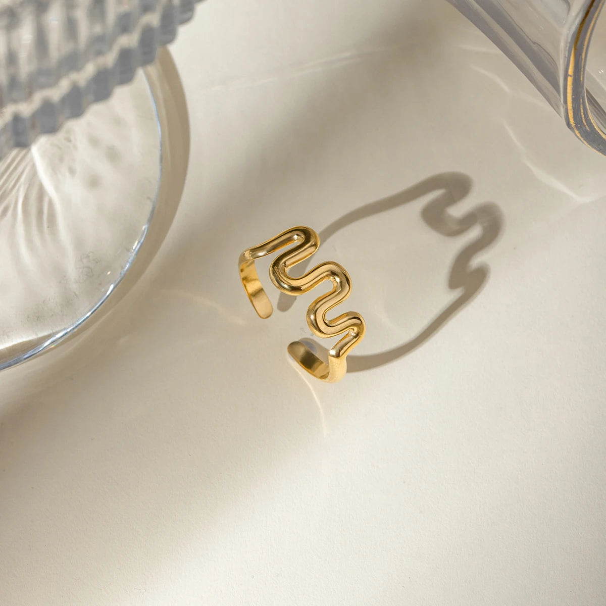 ステンレス304 低ニッケル 水に濡れても錆びにくい 18Kゴールドメッキ リング チャンキー ウェーブ 【YJ03850】