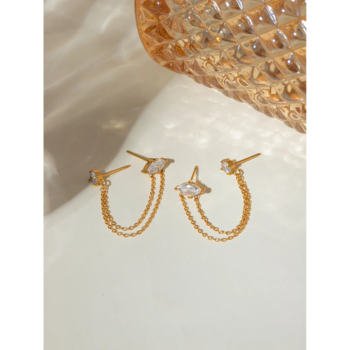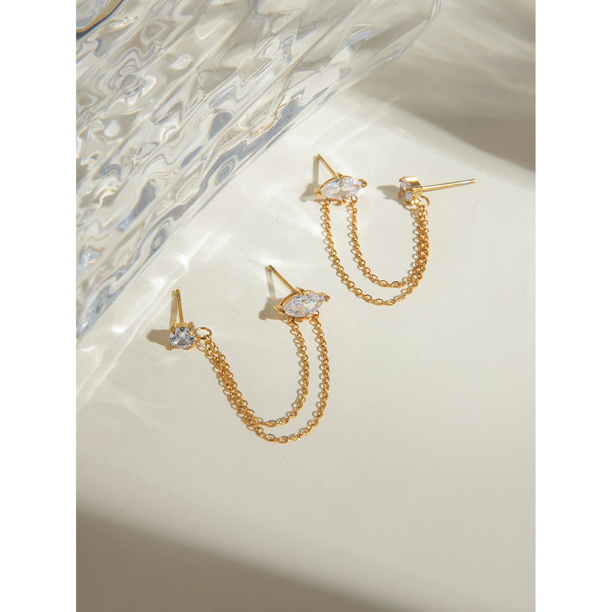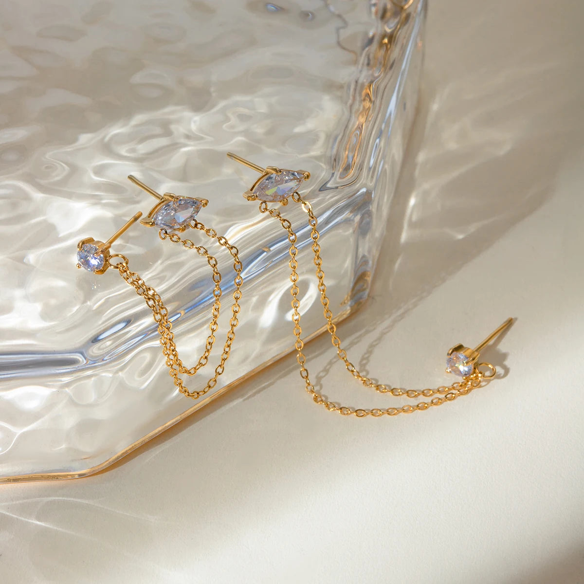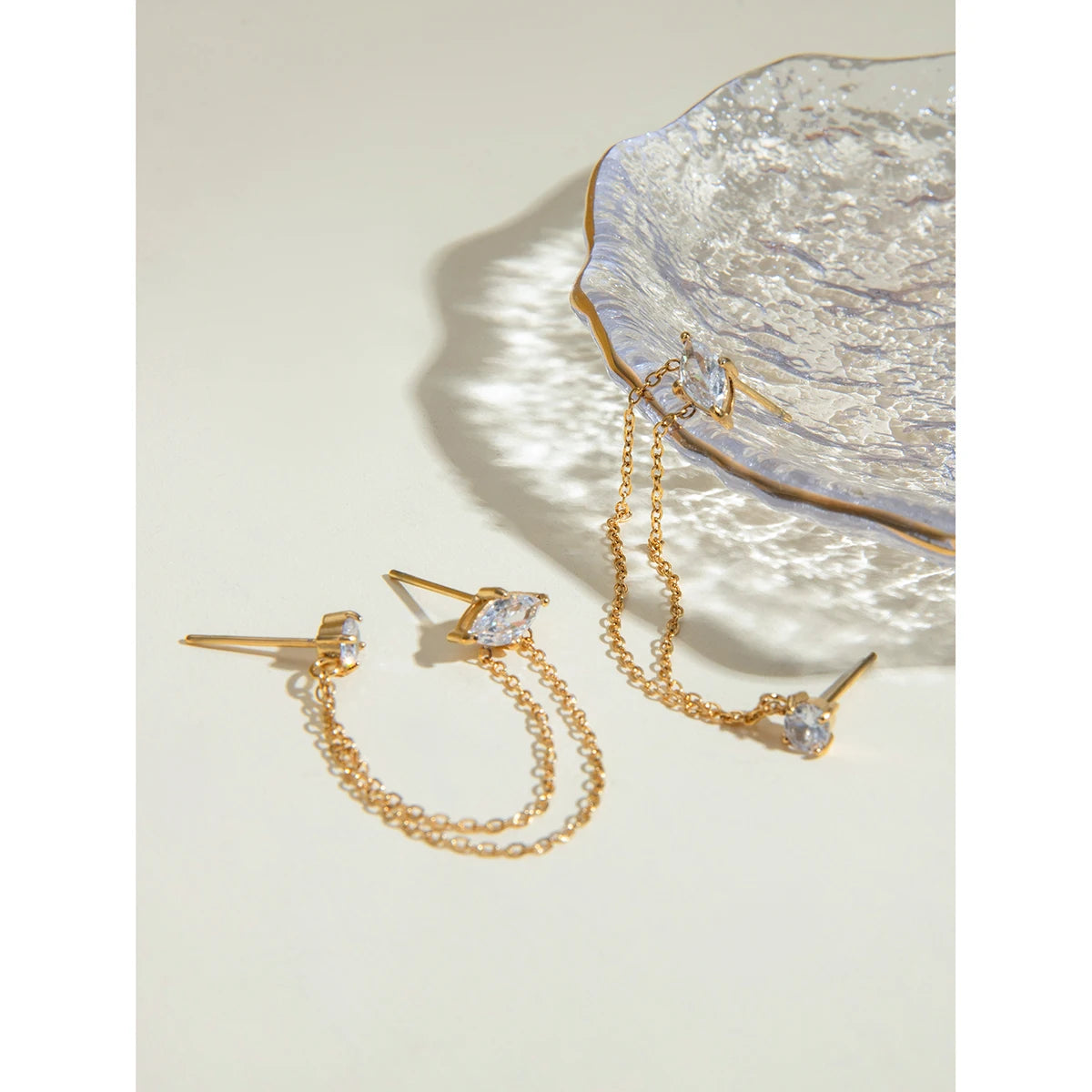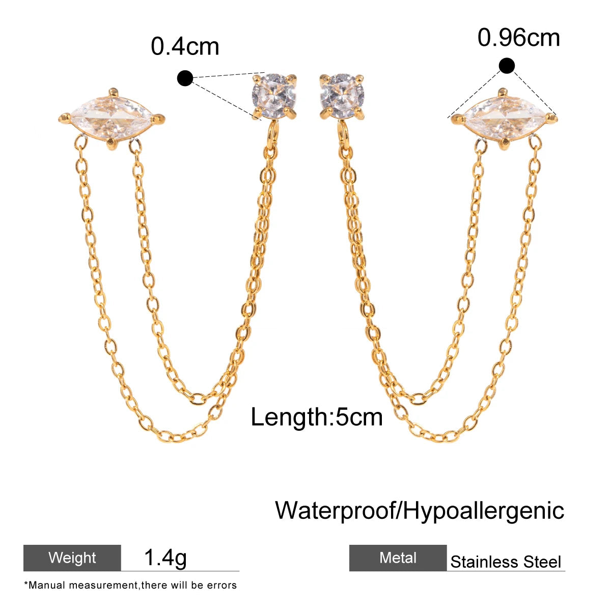 ステンレス304 低ニッケル 水に濡れても錆びにくい 18Kゴールドメッキ ピアス タッセル チェーン ジルコニア 【YJ04022】