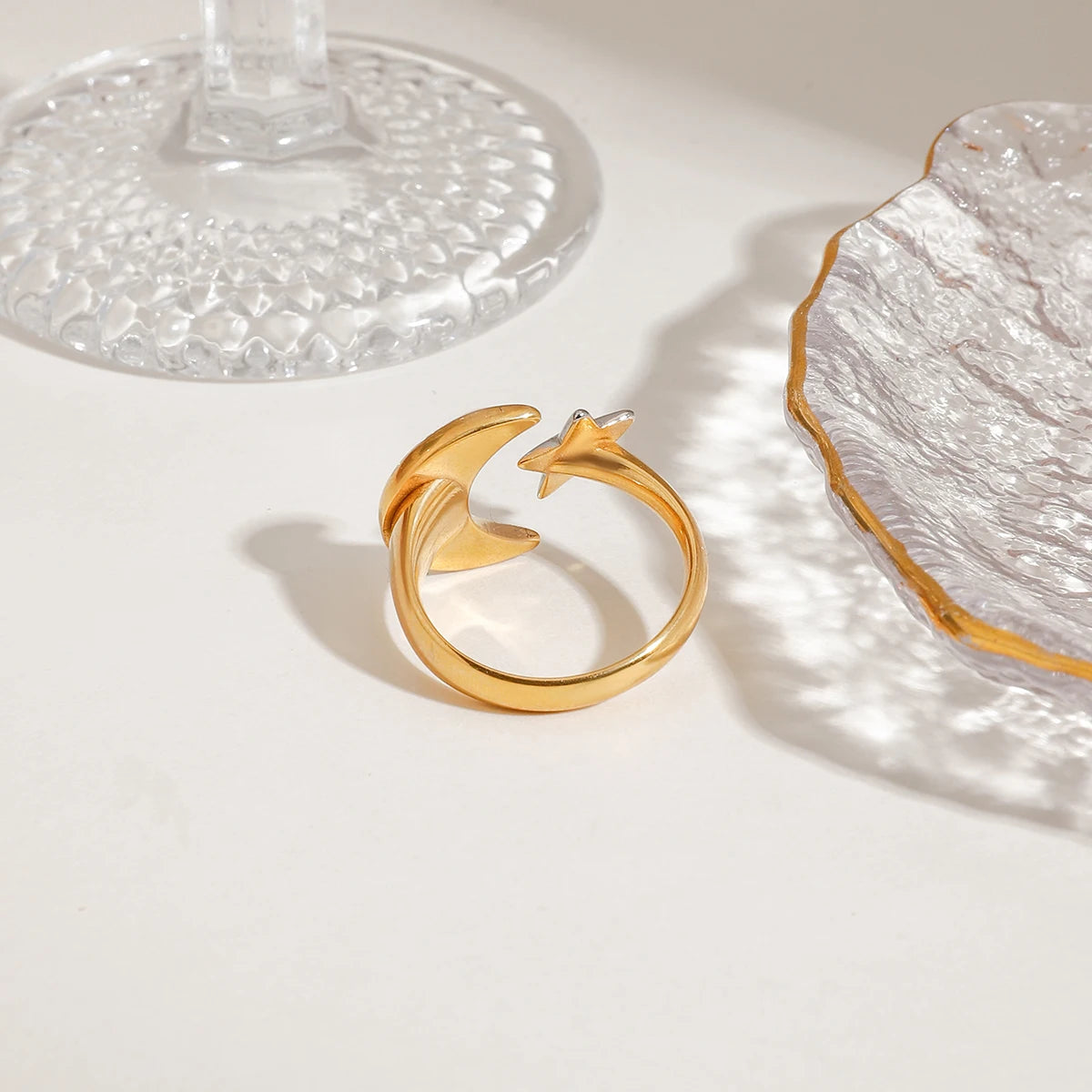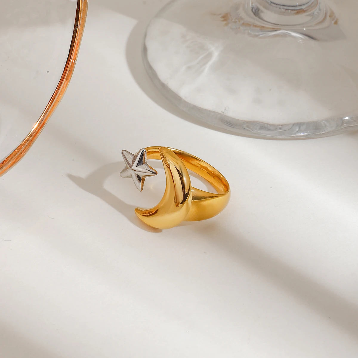 ステンレス304 低ニッケル 水に濡れても錆びにくい 18Kゴールドメッキ リング スター 星 月 【YJ01498】