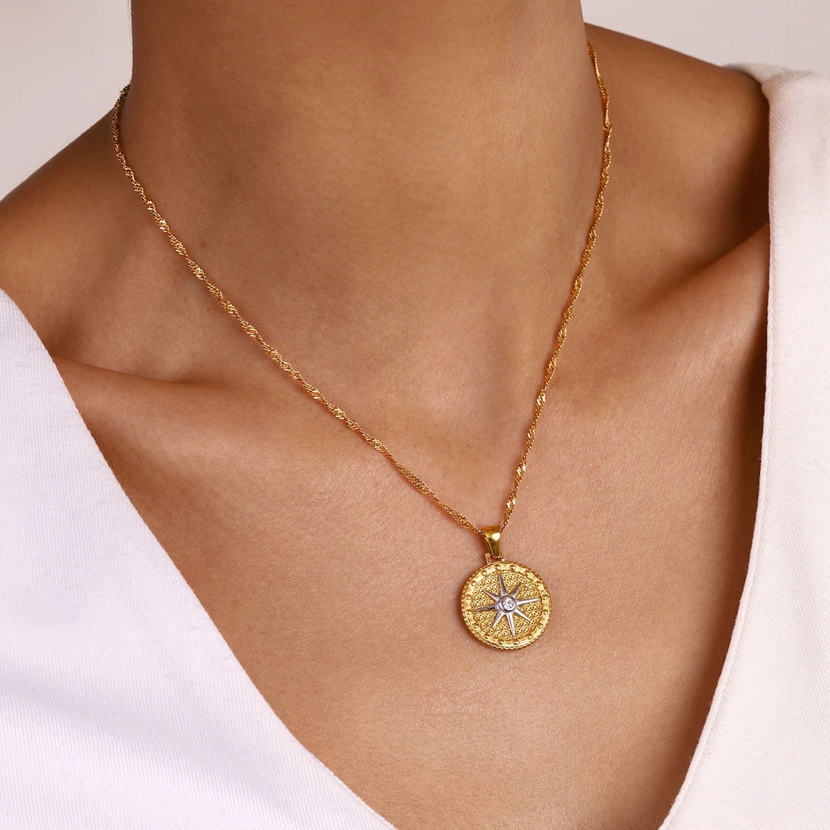 ステンレス304 低ニッケル 水に濡れても錆びにくい 18Kゴールドメッキ ネックレス スター 星 コイン【YJ02441】