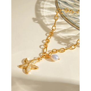 ステンレス304 低ニッケル 水に濡れても錆びにくい 18Kゴールドメッキ ネックレス ヒトデ パール 【YJ02657】