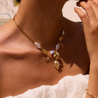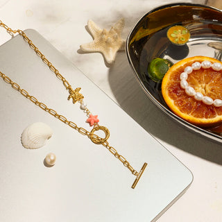 ステンレス304 ニッケルフリー 水に濡れても錆びにくい 18Kゴールドメッキ チェーン ヒトデ シェル 貝殻 パール 【YJ00421】