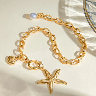 ステンレス304 ニッケルフリー 水に濡れても錆びにくい 18Kゴールドメッキ チェーン ブレスレット ヒトデ シェル 貝殻 【YJ00579】