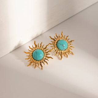 ステンレス304 低ニッケル 水に濡れても錆びにくい 18Kゴールドメッキ ピアス 太陽 ターコイズ 【YJ03550】