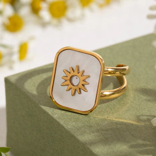 ステンレス304 低ニッケル 水に濡れても錆びにくい 18Kゴールドメッキ リング シェル 貝太陽 スクエア 【YJ03273】