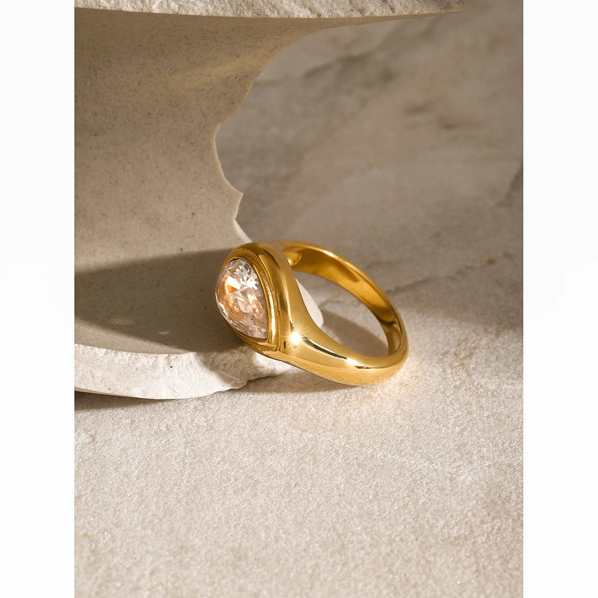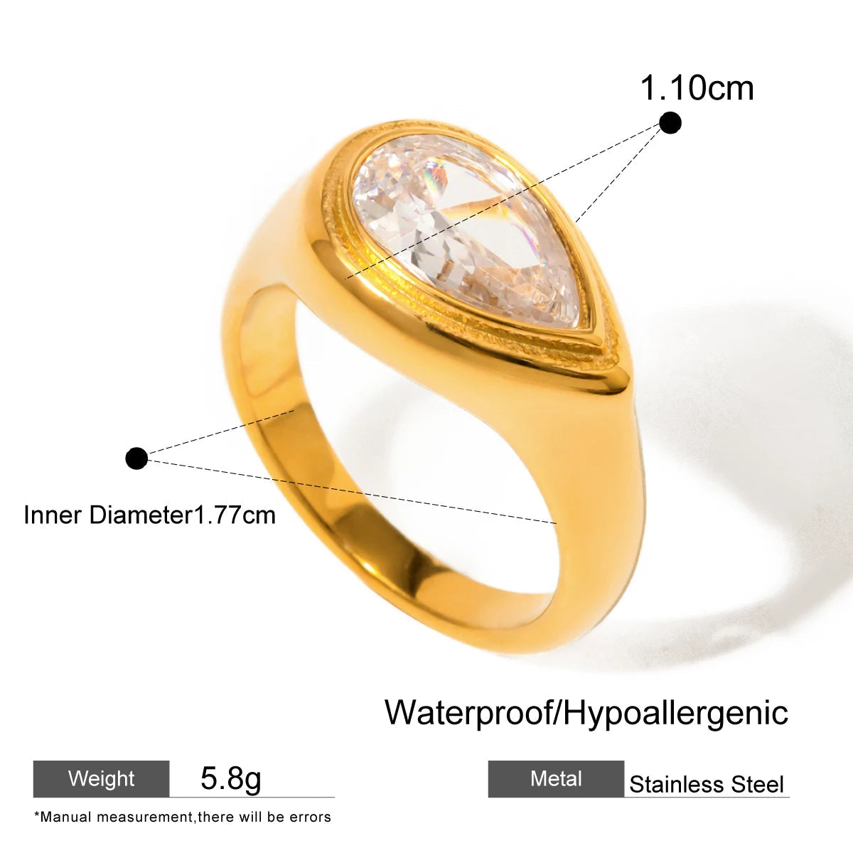 ステンレス304 低ニッケル 水に濡れても錆びにくい 18Kゴールドメッキ リング ティアドロップ ジルコニア 【YJ03788】