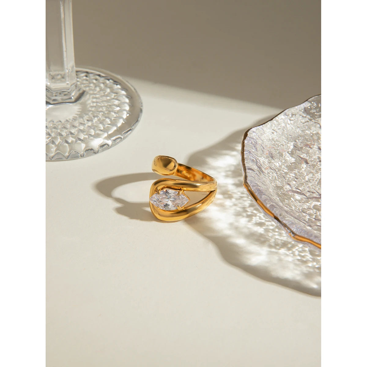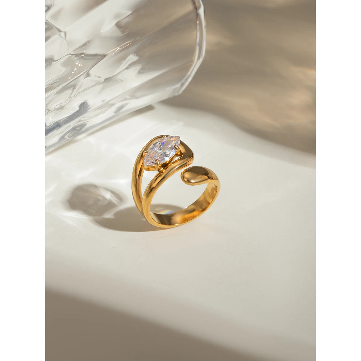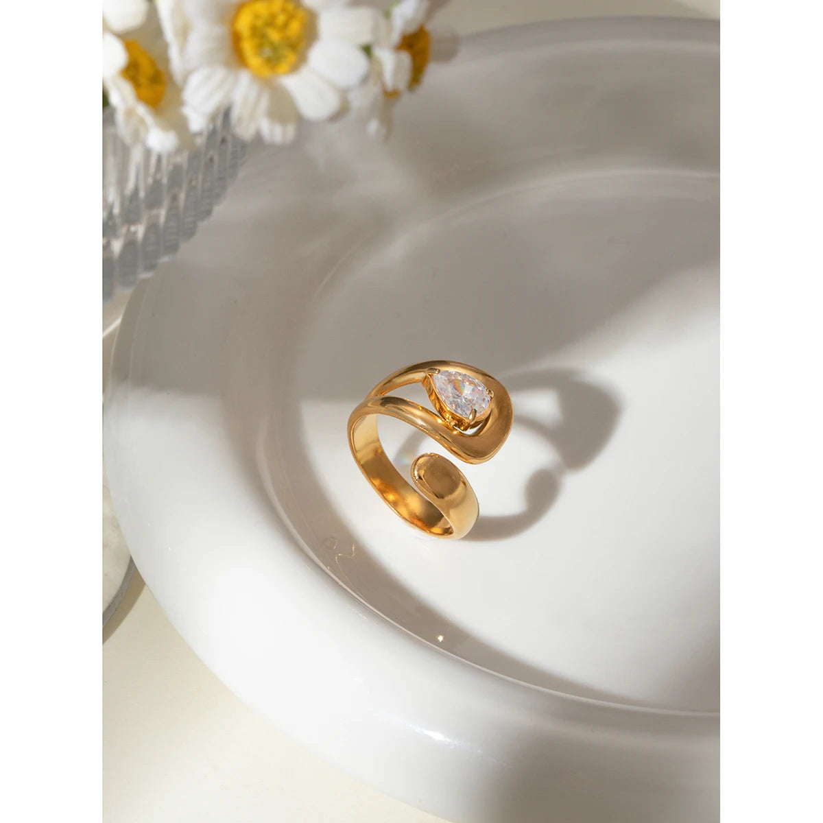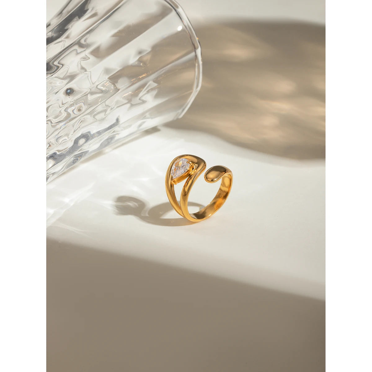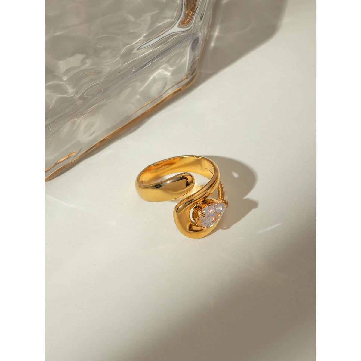 ステンレス304 低ニッケル 水に濡れても錆びにくい 18Kゴールドメッキ リング ティアドロップ ジルコニア 【YJ03855】